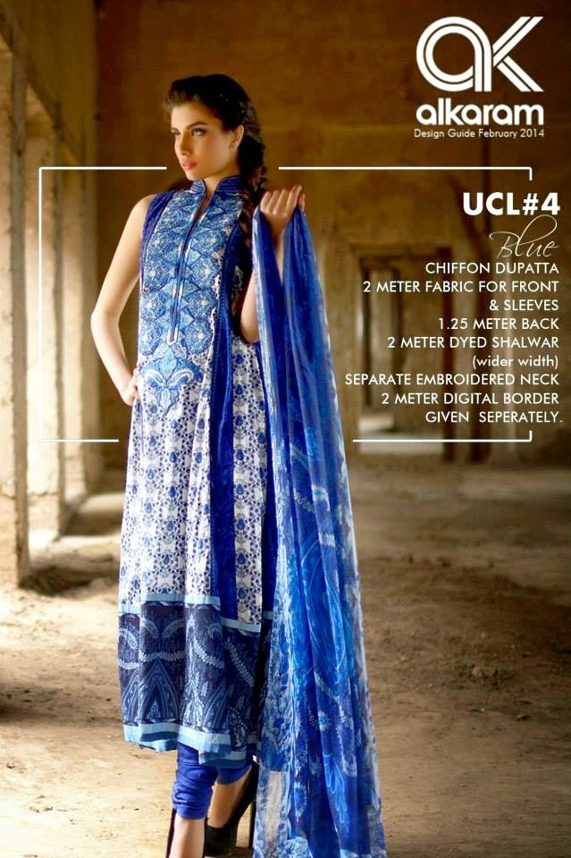 Here is another spectacular seasonal collection of Al Karam Studio. So your wait is finally over because Al Karam Studio has introduced "Umer Sayeed Spring 2014 By Al Karam" for ladies. This collection has been launched few hours ago and this brand has update it's Facebook fan page with alluring addition of spring season. Umer Sayeed Spring '14 collection will be in stores from 28th March. After the getting successful in the launching of various spring - summer ranges like (The Joy of Spring Vol-1 and Vol-2), now they presents novel range of designer collection. Today we are going to presents some-another Umer Sayeed created 3 PC, 4 PC and 5 PC dresses. A lively combination of colorful embroidery and dazzling prints makes their single version outfits a mus-have this season. This dress collection is consists of 2.5 meter lawn shirt, 2 meter dyed shalwar (wider width), chiffon dubatta embellished with embroidered border, printed chiffon sleeves, digital print border and other minor fancy accessories. Umer Sayeed is one of the famous and well known Pakistani fashion designs who designed this marvelous and admirable spring seasonal collection for Al-Karam Studio. Let's see.